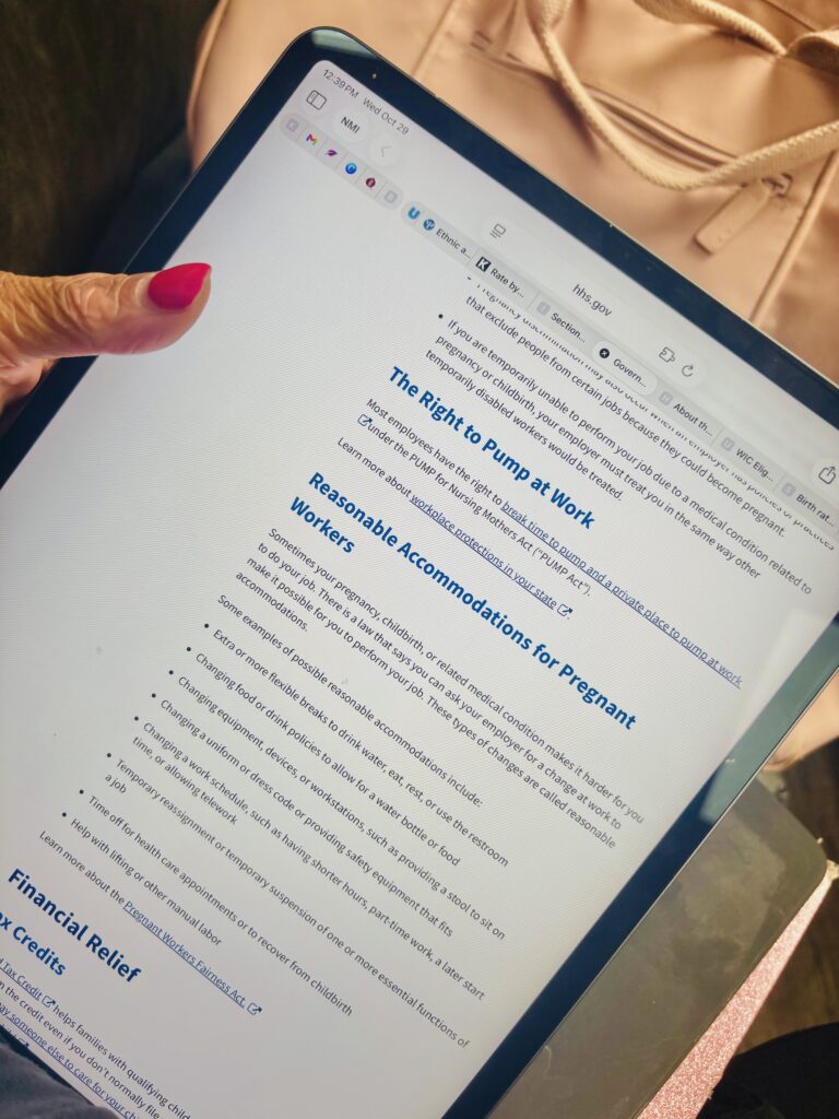 If you’re pregnant or pumping at work, or know someone is – learn more about the Pregnant Worker’s Fairness Act and the PUMP for Nursing Mother’s Act over at MomsRIsing.org and connect to free legal help through A Better Balance or the Center for WorkLife Law.